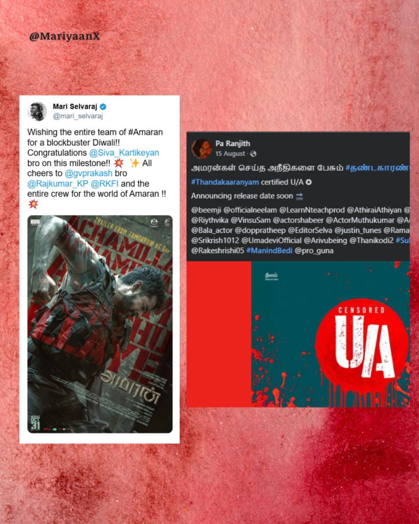 இது ரஞ்சித், மாரி செல்வராஜ் ஆகிய இருவரின் அரசியல் நிலைப்பாடுகளின் தன்மையை வெளிக்காட்டுகின்றன. ‘அமரன்’ வெளியான போது, ராணுவ உடையோடு வன்முறையில் ஈடுபடும் சிவகார்த்திகேயன் போஸ்டரைப் பகிர்ந்த மாரி செல்வராஜ் அந்தப் படத்திற்கு வாழ்த்து தெரிவித்திருந்தார். சில மாதங்களுக்குப் பிறகு, ராணுவத்தின் மறுபக்கத்தை வெளிப்படுத்தும் ’தண்டகாரண்யம்’ படத்தின் போஸ்டரைப் பகிர்ந்த அதன் தயாரிப்பாளர் ரஞ்சித், ‘அமரன்கள் செய்த அநீதிகளை பேசும் #தண்டகாரண்யம்’ என்று நேரடியாகவே விமர்சித்திருந்தார். இவை ஒரு தலித் கலைஞன் பொது ஏற்பைப் பெறுவதன் பொருட்டு பேசும் வெவ்வேறு முனைகளை நமக்குக் காட்டுகின்றன.